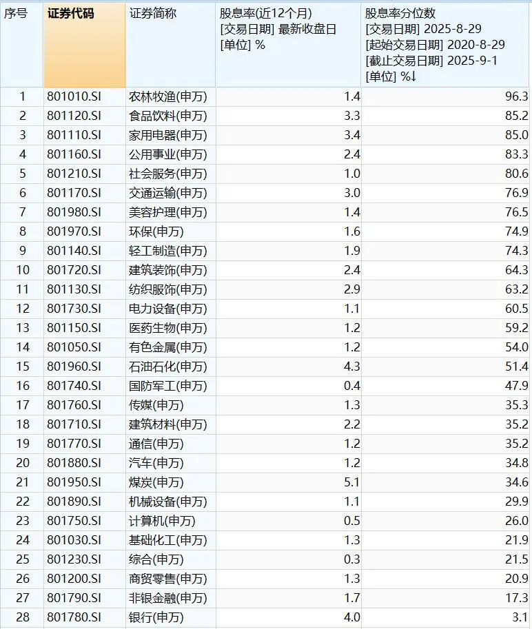 一个是农林牧渔,目前股息率分位96.3%,处于历史极低的位置,代表选手牧原股份(股息率4.21%)