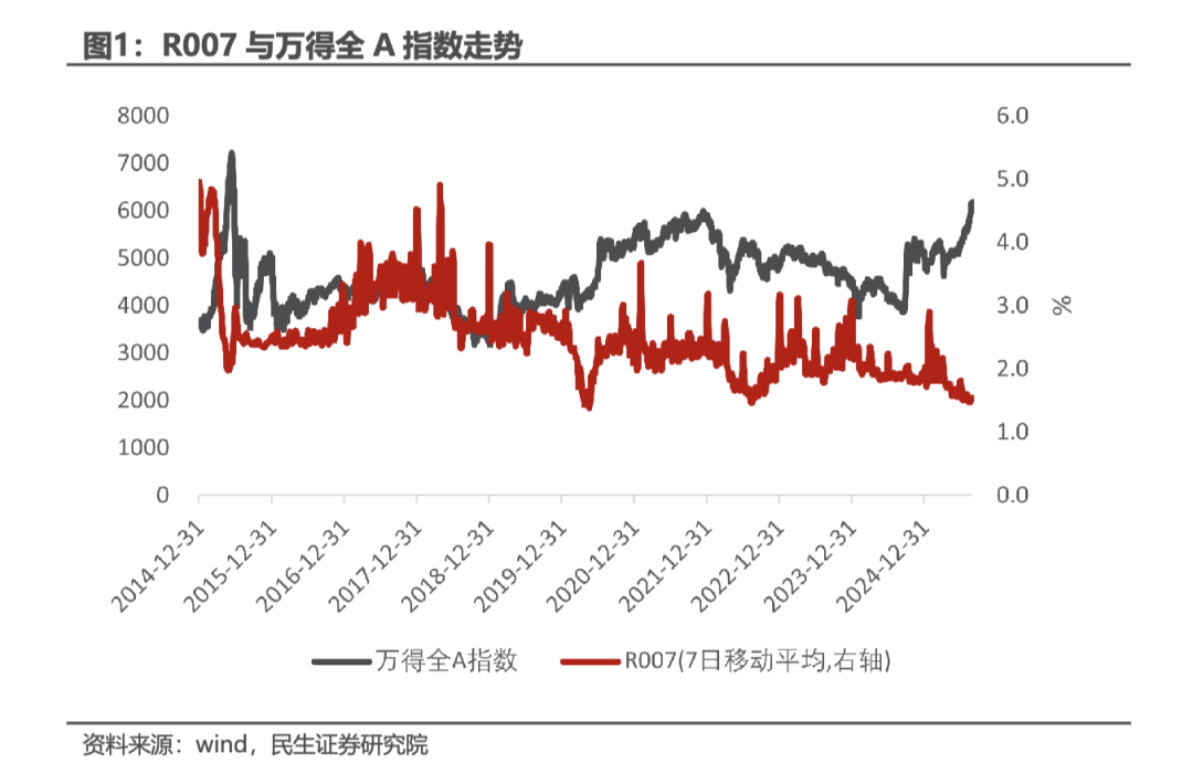 从上涨驱动力来看,本轮牛市流动性为主导。历史上牛市的驱动力主要分企业盈利驱动与流动性驱动两种,其中企业盈利驱动的牛市见顶信号通常为企业盈利出现拐点,流动性驱动的牛市见顶信号则是流动性快速收紧。今年以来的市场上涨主要由流动性宽松所驱动,A 股景气度虽基本见底但仍处于较低位置,上涨的驱动力或处于由流动性驱动向企业盈利驱动切换的初期。当前以 R007 观测的短端利率仍处于下行趋势,整体处于相对低位,没有快速抬升的迹象,目前并未发出流动性收紧信号。