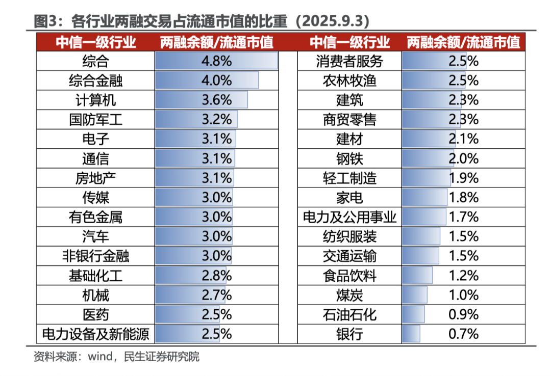 9月7日,民生证券研究院指出,市场交易存在过热现象,历史经验来看调整后短期内再大幅上涨概率较低,或进入中继再吸筹阶段,两融交易若热度骤减可能会对TMT等两融交易参与度较高的板块短期内产生一定冲击。