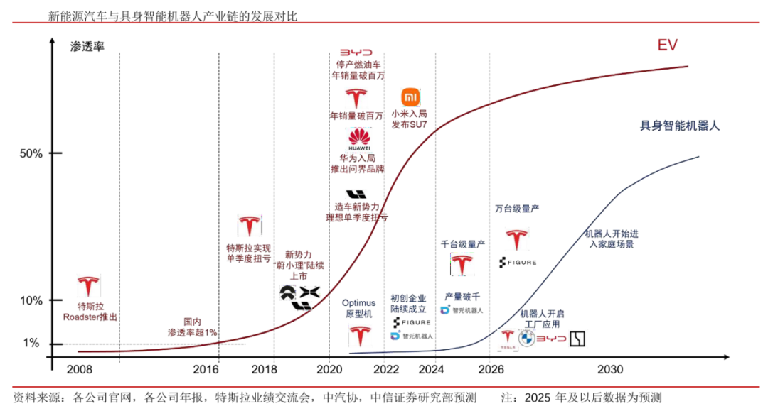 类比新能源汽车产业链,当前具身智能机器人产业处于爆发前夕。