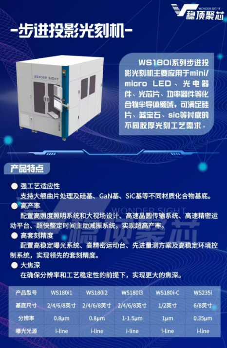 资料显示,这款步进式光刻机属于稳顶聚芯WS180i系列,主要应用于mini/micro LED光电器件、光芯片、功率器件等化合物半导体领域,能够满足硅片、蓝宝石、SiC(碳化硅)等衬底的不同胶厚光刻工艺需求。在具体参数方面,稳顶聚芯WS180i系列覆盖2~8英寸晶圆,分辨率覆盖1.5μm~0.35μm。