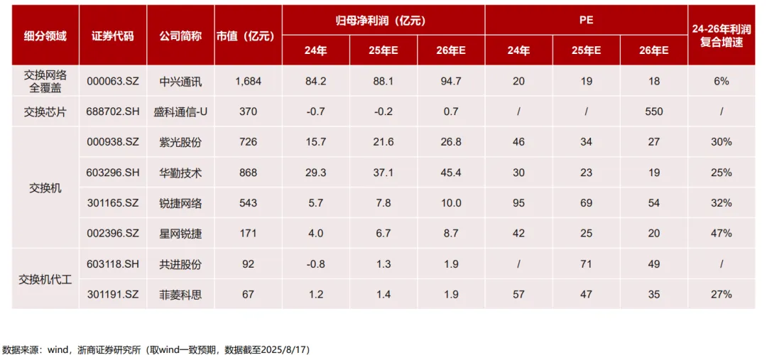 华为(35.8%)、新华三(32.4%)、锐捷(14.6%)三强主导。核心标的: