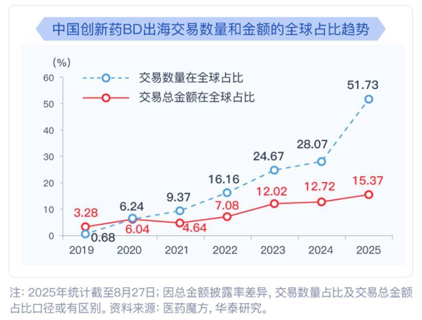 国内药企交易金额在全球交易中占比超51%(2024年仅为28.07%)