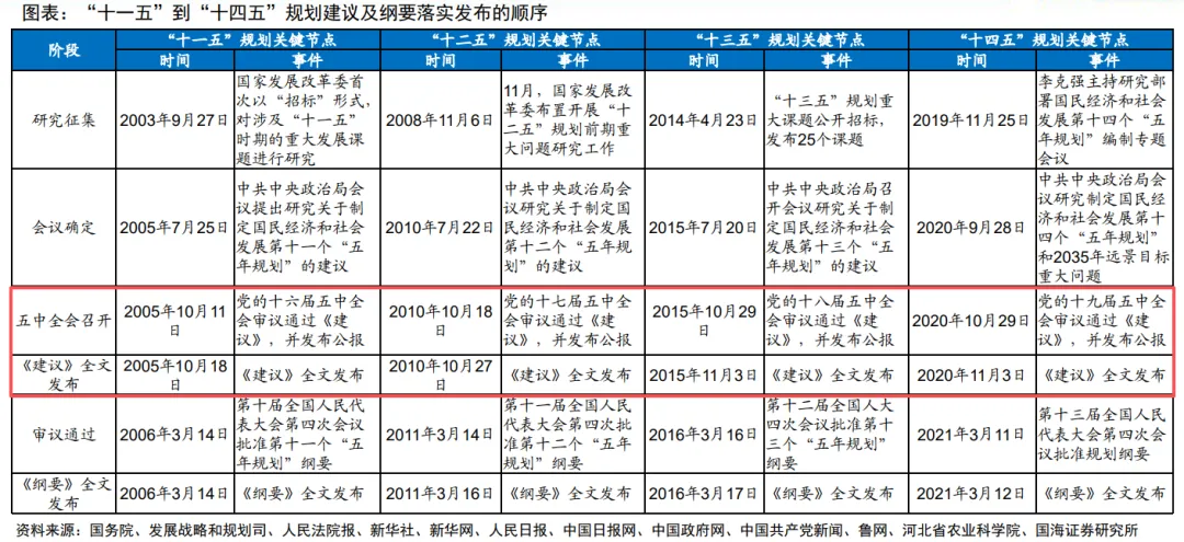 回顾过去20年的四次“五年规划”,《五年规划建议》一般在上一阶段“五年规划”结束年份的10月通过五中全会审议并发布公报,《建议》全文在10月底或11月初发布。《五年规划纲要》全文一般在新一阶段规划首年的3月中旬发布。“五年规划”《建议》时间发布更早且具有较强的指导性。