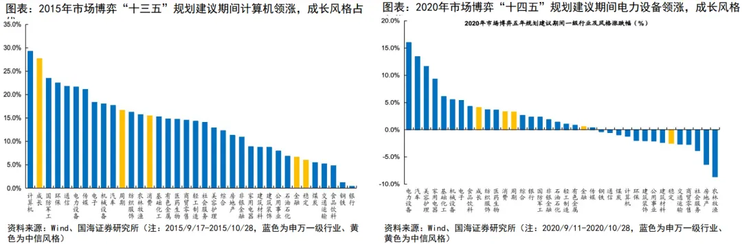 从近两次的“五年规划”看,2015年,自9月16日最后一次千股涨停市场情绪逐步回归理性后(2015.9.17-2015.10.28),市场围绕“五年规划”建议相关主题博弈。计算机(29.2%)、通信(21.8%)等TMT行业表现较好。风格来看,成长风格领跑市场。2020年,市场集中交易创业板改革与注册制试点,“炒小炒差”妖风盛行。新华社发布评论整顿后(2020.9.11-2020.10.28),市场围绕“五年规划”建议相关主题博弈。电力设备(16.0%)领涨,市场围绕“双碳”主题交易;风格来看,成长风格显著占优。