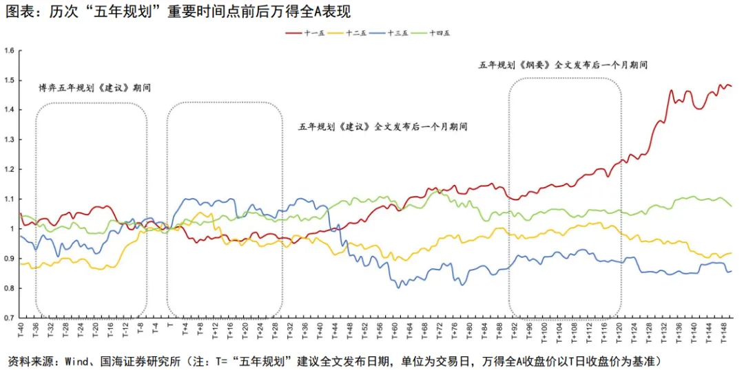 在市场中,在博弈“五年规划”建议期间、《建议》全文发布及《纲要》发布后的一个月左右时间,市场呈现出交易“五年规划”相关投资机会的倾向。
