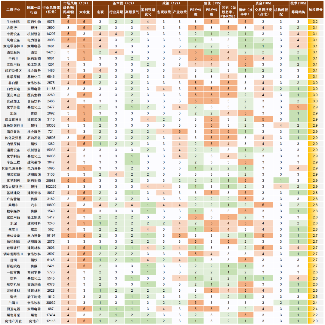 2)基本面,其中有自上而下从消费、出口、投资、全球等因素判断宏观环境与行业的关联,也有自下而上从行业周期位置、高频景气数据跟踪和盈利预期调整进行赋分,其中行业周期位置与前述产能周期高度结合,是权重最高项目;