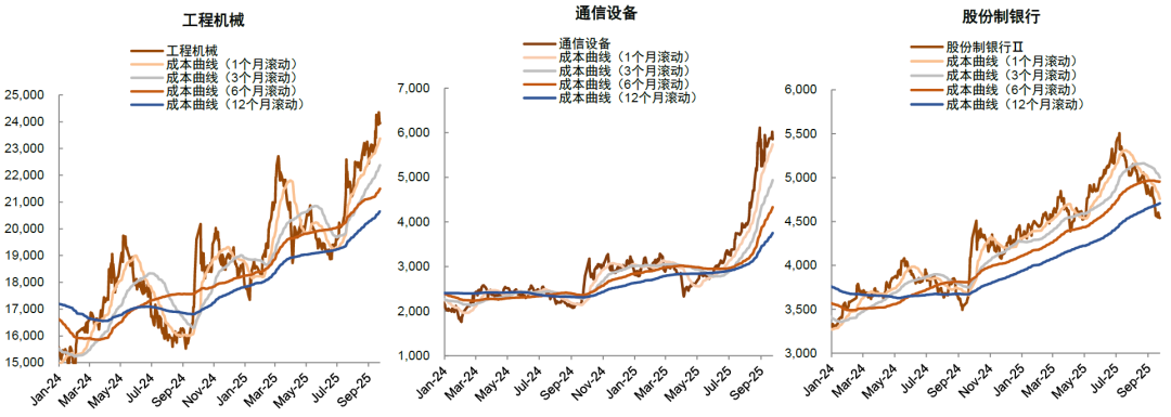 图表16:筹码结构示例,工程机械最优,通信设备偏离成本曲线过大,股份制银行筹码成本结构变差