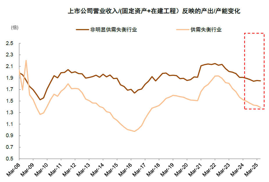 图表9:非明显供需失衡行业的产出/产能基本企稳,供需失衡行业仍在下降