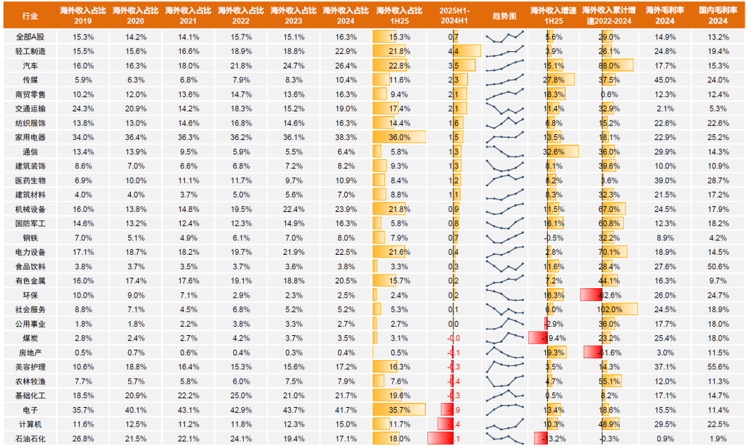 上市公司海外业务收入占比普遍提升,全部非金融企业由2021年14.1%的占比提升至2024年的16.3%,1H25全部A股上市公司海外收入同比增速5.6%,占比进一步提升,一定程度上弥补了内需的相对不足。