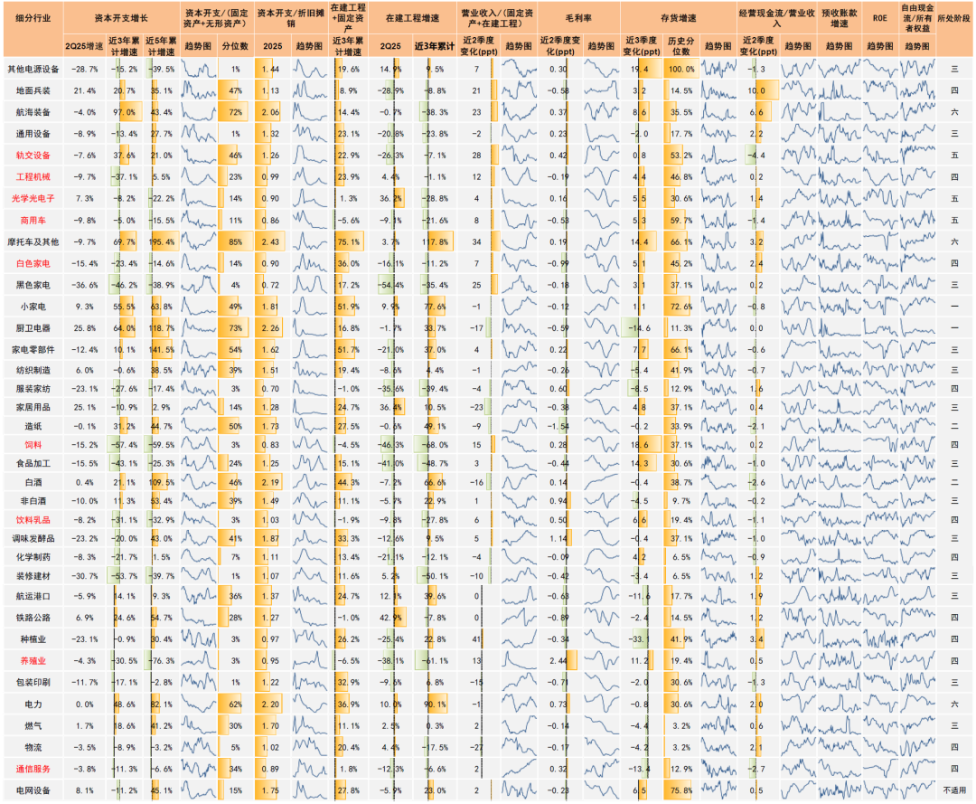 综上来看,建议重点关注位于产能周期阶段四、五的细分行业,包括:工业金属、小金属、电池、消费电子、元件、汽车零部件、医疗服务、通信设备、工程机械、养殖业、饲料、饮料乳品、光学光电子、轨交设备、商用车。但也有部分高景气成长行业并不符合典型产能周期特征,资本开支和景气周期同步回升同样是较好的机会,例如半导体、机器人等。