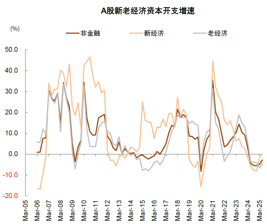产能周期视角下的投资机会有望增多。从非金融企业整体的产能周期来看,2023年以来资本开支增速开始下滑并在2024年转为负增长,2025年以来在建工程也转为负增长,显示去产能取得了一定的成效(图表6)。而且2025年上半年新经济领域的资本开支已经转为正增长(图表7)。