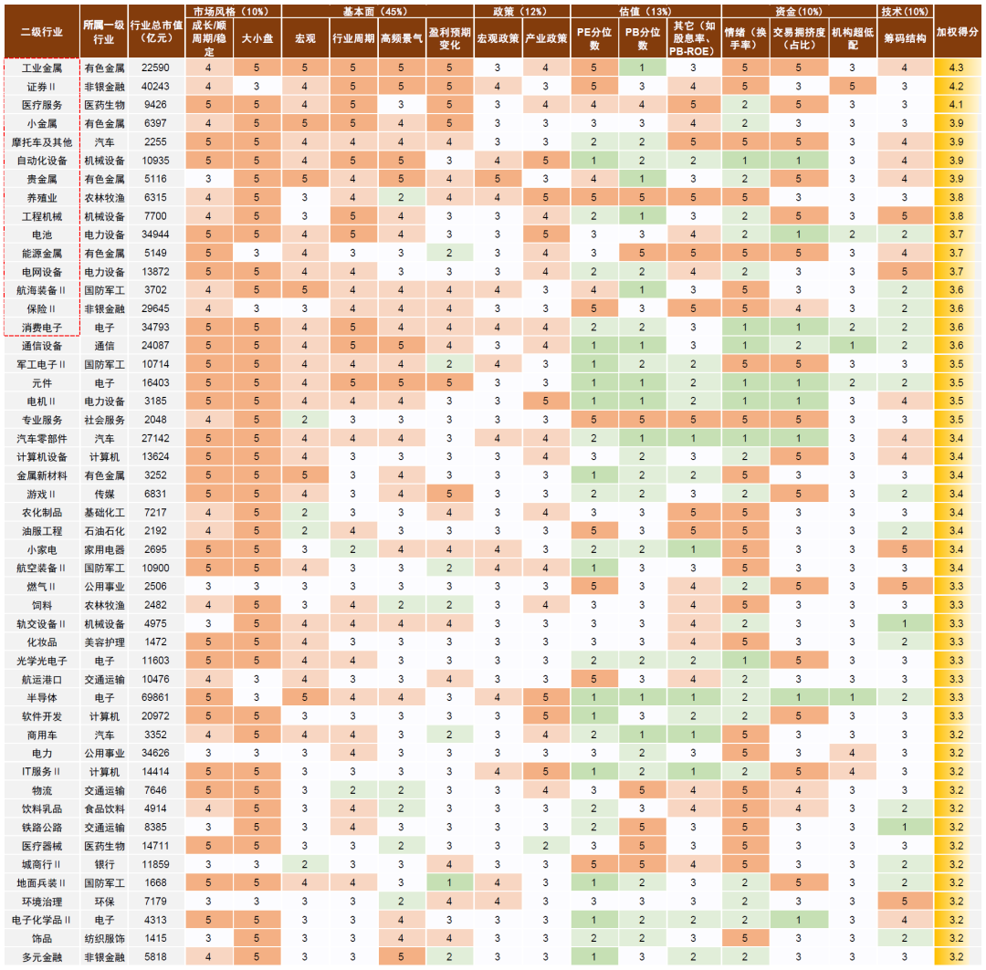 基于上述思路,当前加权打分结果排序前15%,建议配置的备选行业分别是:工业金属、证券、医疗服务、小金属、摩托车及其他、自动化设备、贵金属、养殖业、工程机械、电池、能源金属、电网设备、航海装备、保险和消费电子。