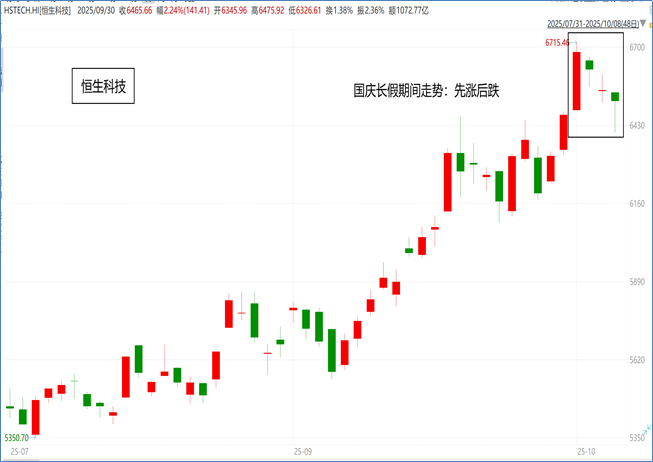 (下图可以看出,假期港股跟随美股先涨后跌,恒生科技回落更为明显,对A股影响也更大)