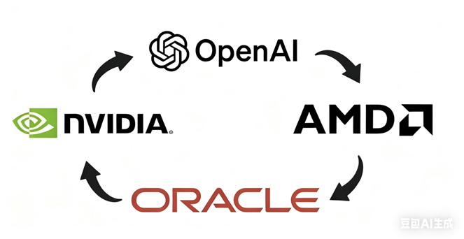 英伟达掏钱投资OpenAI,OpenAI把这笔钱转交给甲骨文搞算力基建,甲骨文再拿这笔钱去买英伟达的算力芯片。钱流转一圈,又回到英伟达手里,看起来什么都没变,但每个人的市值都上了一个台阶。