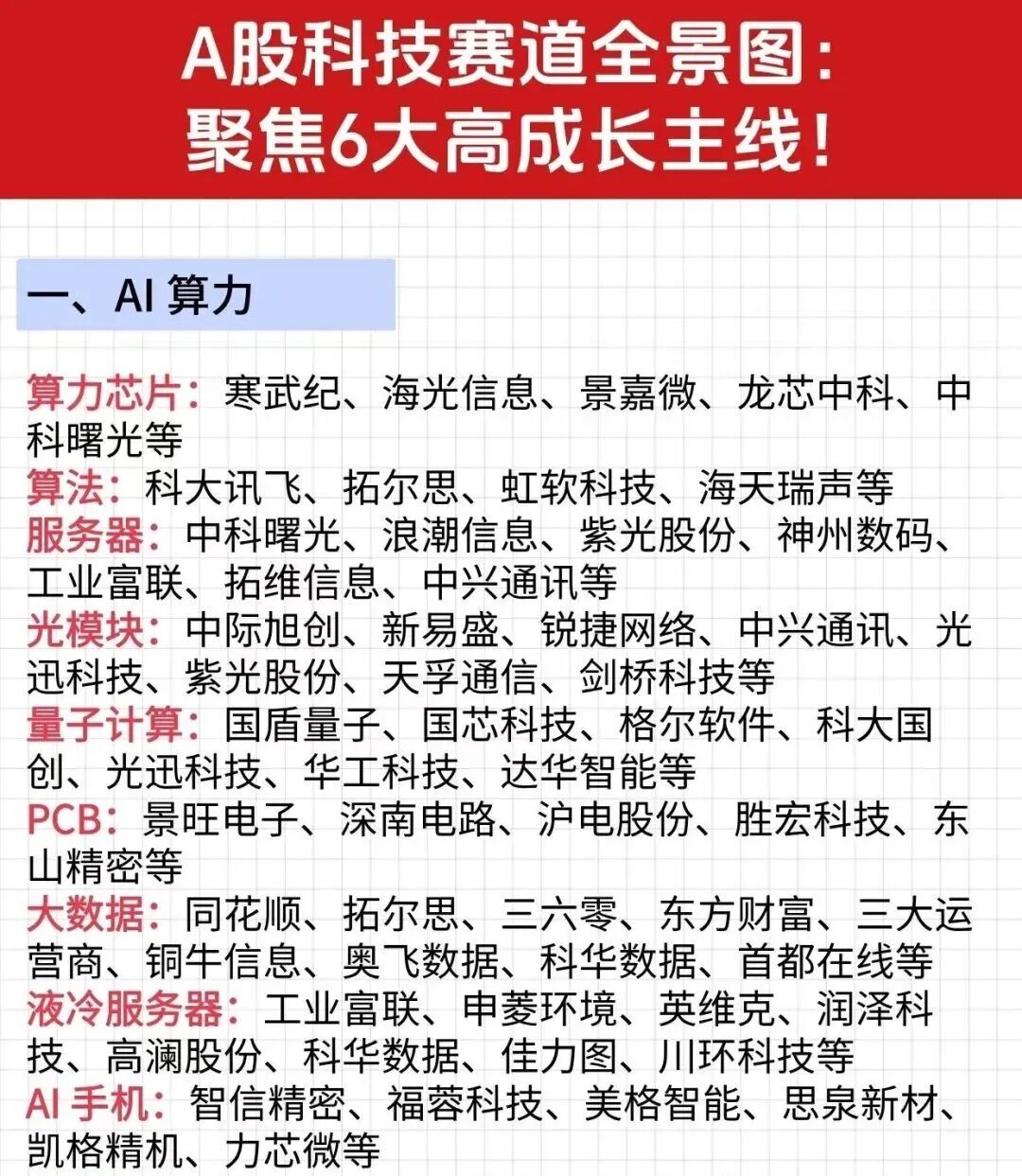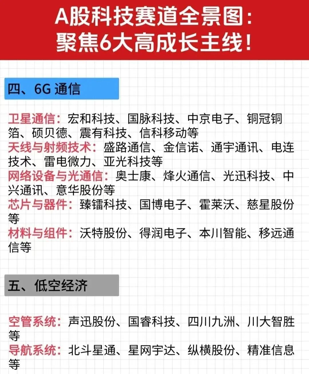 当下热门题材,值得关注的六大高成长科技主线:AI算力概念、人形机器人概念、低空经济概念、半导体芯片概念、华为题材概念、6G通信概念。各大主线赛道核心龙头代表有哪些?