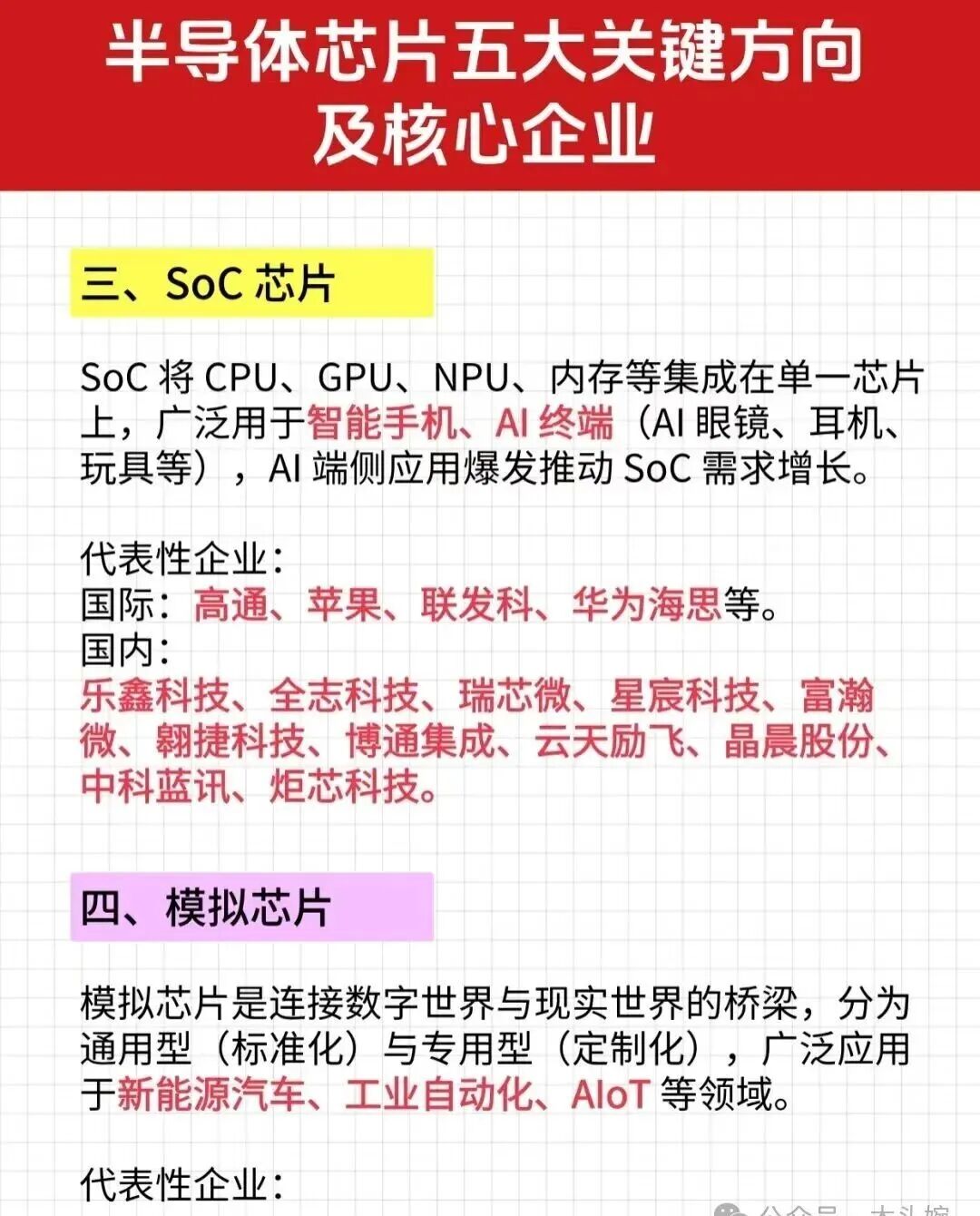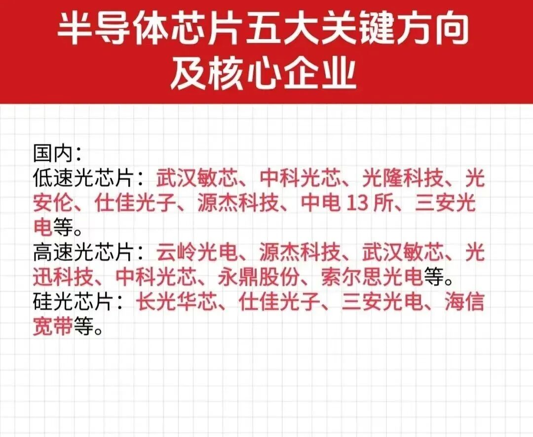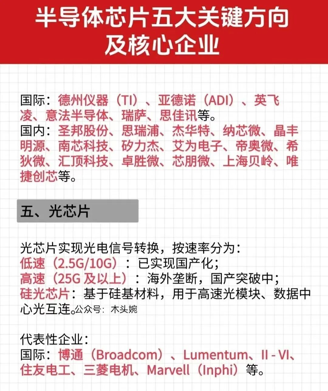 半导体芯片重点关注的五大关键方向:算力芯片概念、存储芯片概念、模拟芯片概念、光芯片概念、系统级芯片概念。各细分领域国内外领先龙头企业有哪些?