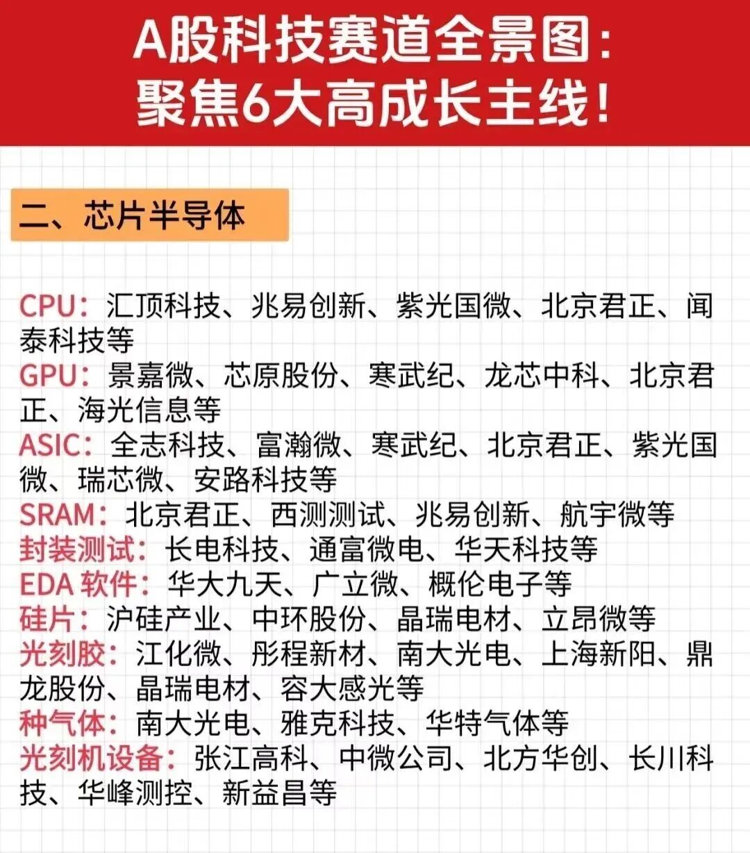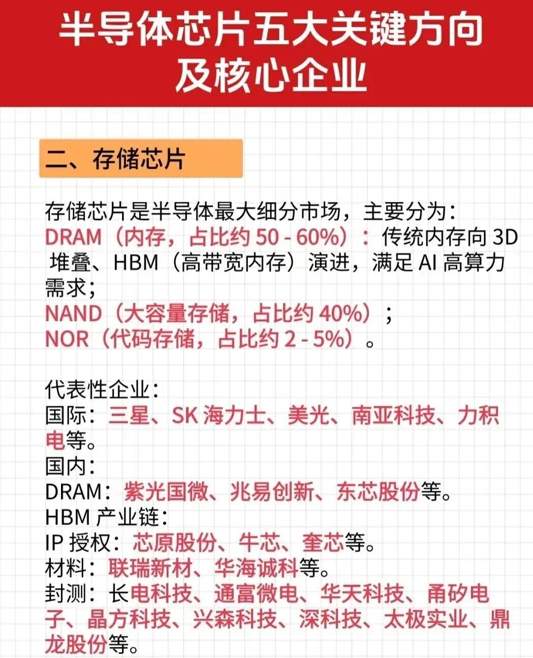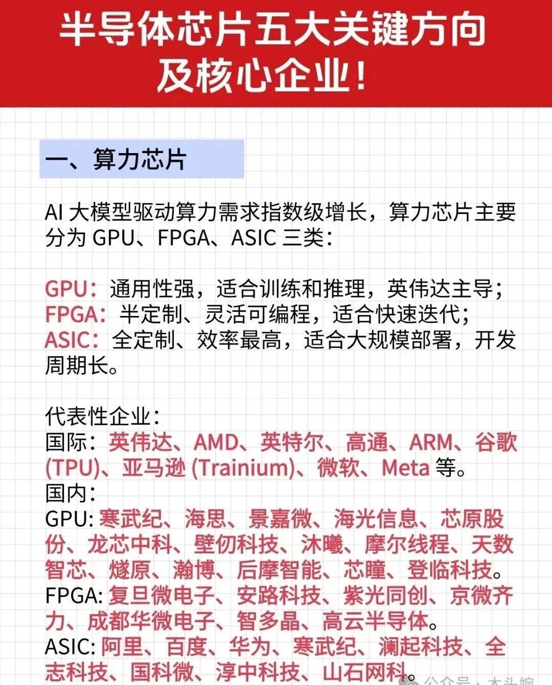 半导体芯片重点关注的五大关键方向:算力芯片概念、存储芯片概念、模拟芯片概念、光芯片概念、系统级芯片概念。各细分领域国内外领先龙头企业有哪些?