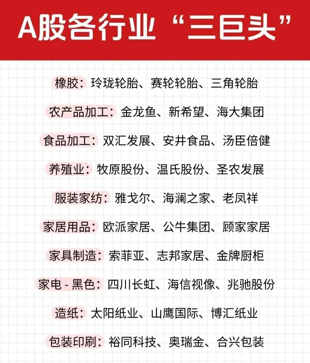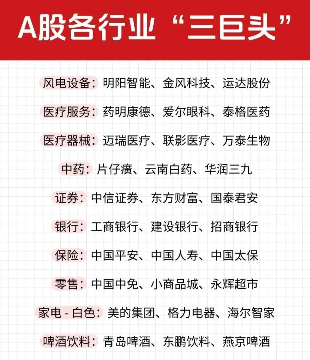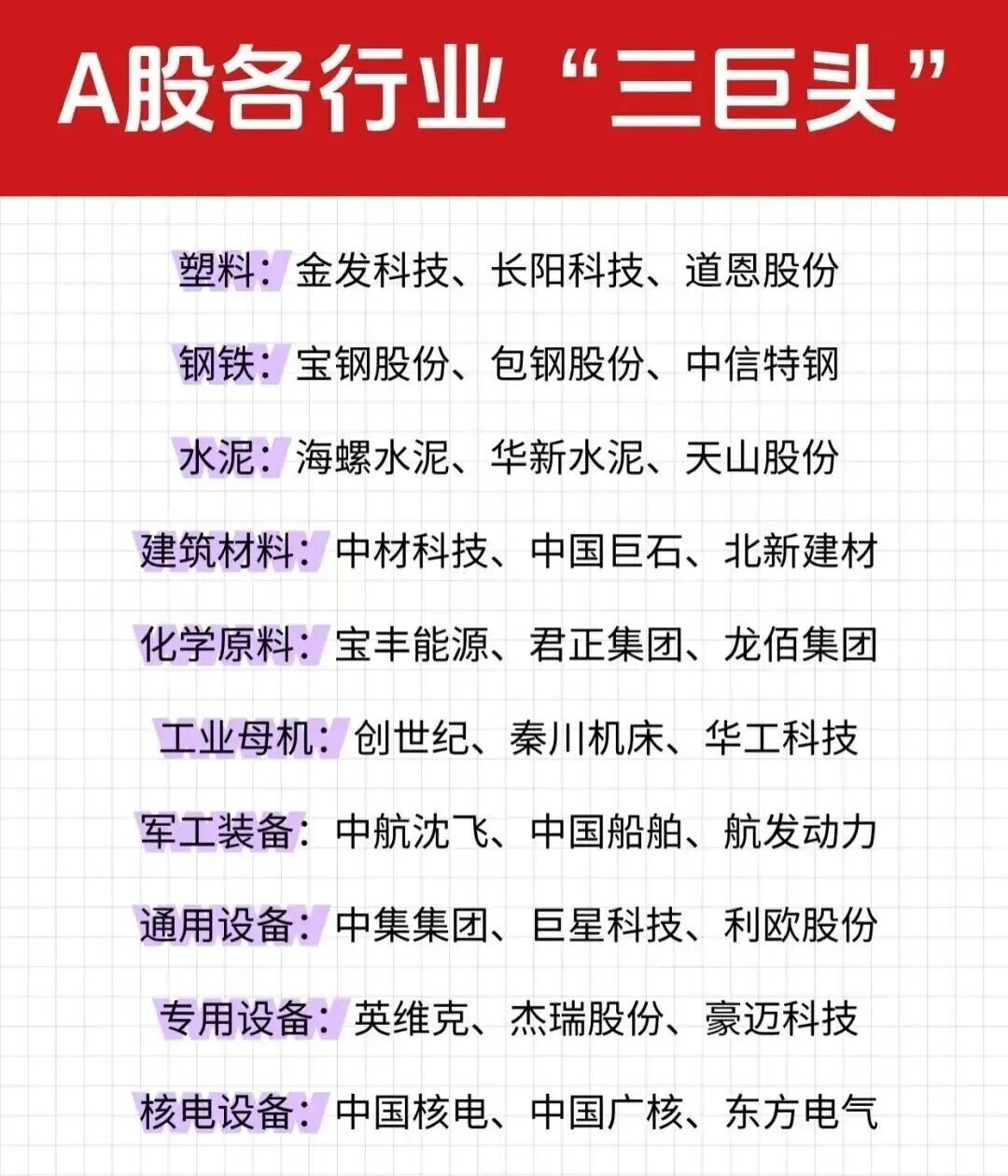 各行各业三大巨头公司集合整理,包括65个行业板块,没有杂毛都是绝对核心代表。当然行业龙头不代表股价趋势,资料仅供参考!
