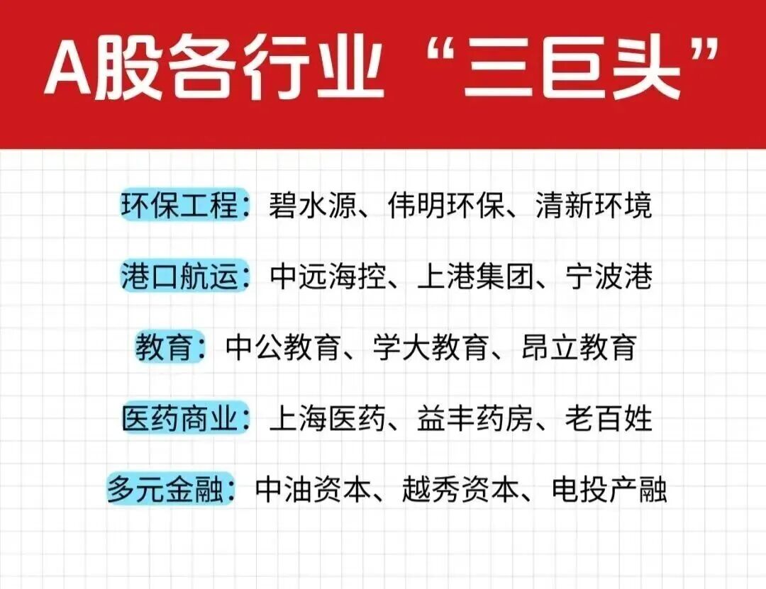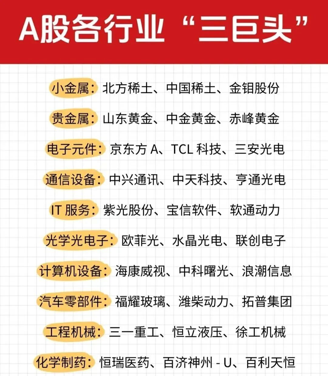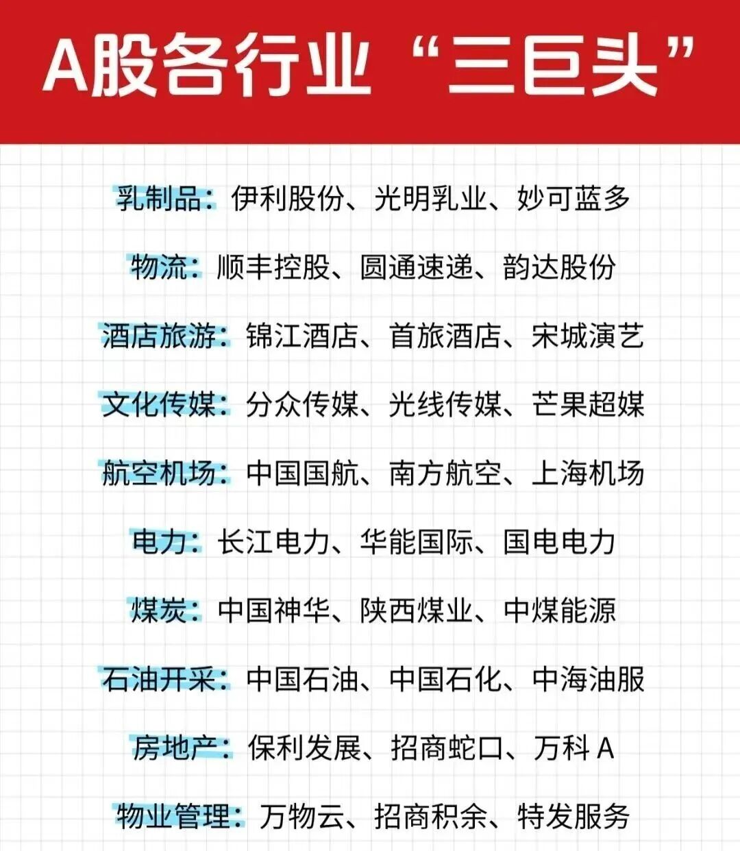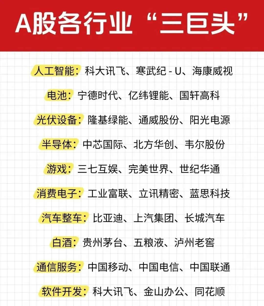 各行各业三大巨头公司集合整理,包括65个行业板块,没有杂毛都是绝对核心代表。当然行业龙头不代表股价趋势,资料仅供参考!