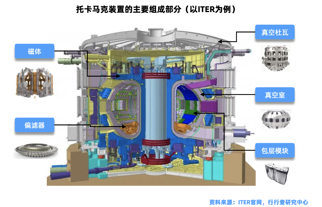 核心设备包括磁体、偏滤器、第一壁、磁体支撑等核聚变主机设备,以及压力容器、蒸汽发生器、汽轮机、发电机、各类泵阀等其他设备。