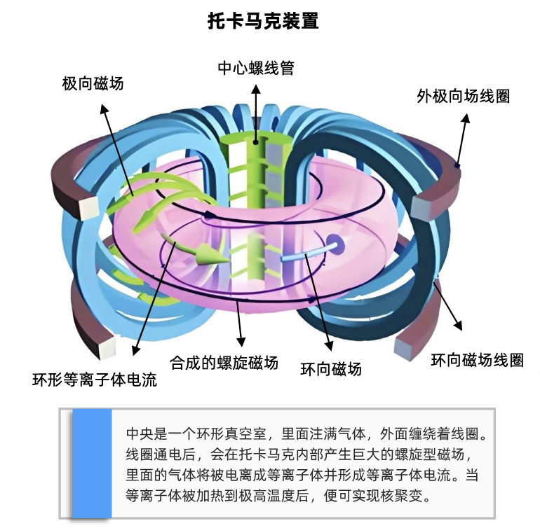 当前我国聚变研究进入世界第一方阵,代表如东方超环、中国环流三号。