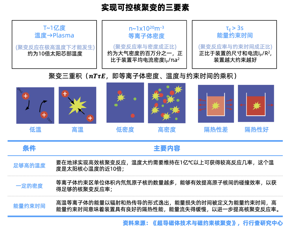 实现核聚变反应,需要同时满足三个条件:即足够高的温度、一定的密度和一定的能量约束时间。三者的乘积称为聚变三乘积。