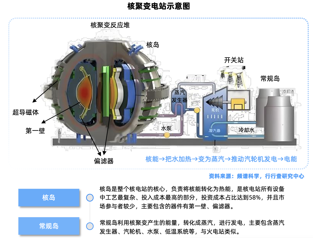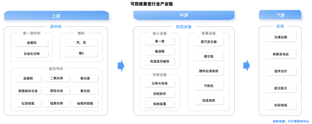 可控核聚变产业链主要分为上游原材料、中游设备、下游应用三大环节,其核心商业模式是发电。