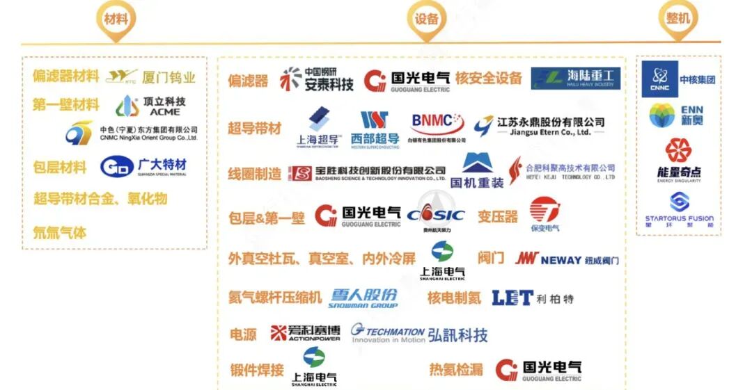 核聚变产业链核心环节和部分厂商: