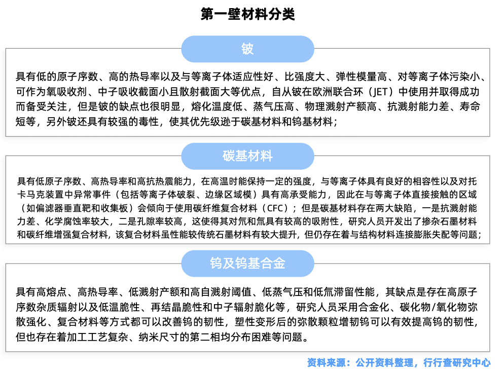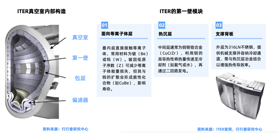第一壁:作用是控制进入等离子体的杂质、传递辐射到材料表面的热量等。