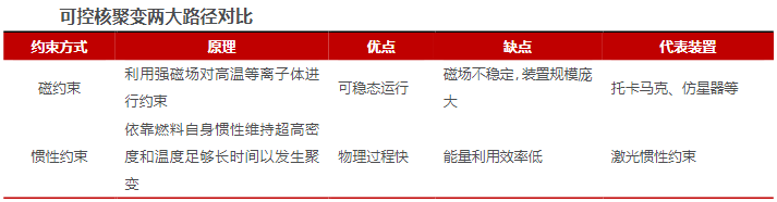 核聚变实现方式主要包括磁约束、惯性约束、引力约束。引力约束是恒星内部的聚变机制,地球无法复制巨大的引力场进行约束,因此核聚变的研究主要沿着磁约束和惯性约束两大途径进行。
