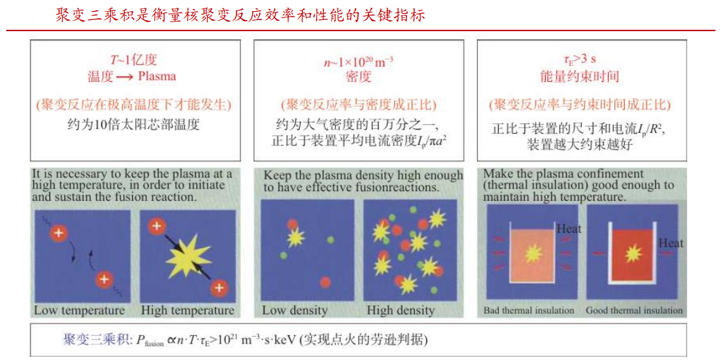 三者的乘积称为聚变三乘积。根据劳逊判据,只有聚变三乘积大于一定值,才能产生有效的聚变功率输出。