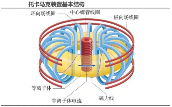 托卡马克装置是典型的磁约束聚变装置,主要由为等离子体提供清洁环境的真空室及为控制与约束等离子体的磁体系统组成。托卡马克的中央是一个环形的真空室,外面缠绕着线圈,将磁场弯曲成环形,避免高温等离子体与装置内壁直接接触。在通电的时候托卡马克的内部会产生巨大的螺旋型磁场,将其中的等离子体加热到很高的温度,以达到核聚变的目的。