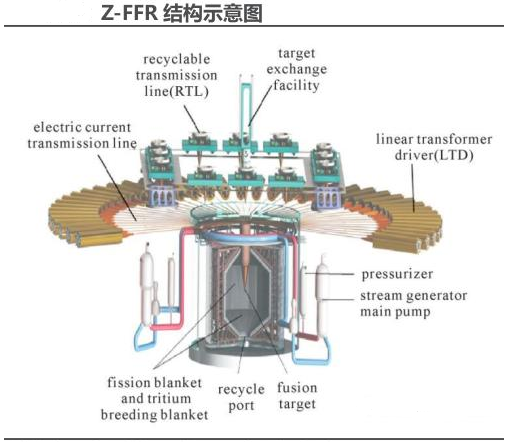 直线箍缩装置(Z-pinch)是一种开端系统的聚变装置,属于惯性约束装置。其原理是在柱形放电管中通过强大的电流,来使其中的等离子体产生箍缩效应而受到压缩和加热,以形成高密度的灼热等离子体。基于脉冲功率技术的快Z箍缩技术可以实现驱动器电储能到Z箍缩负载动能或X射线辐射能的高效率能量转换,能量较为充足,驱动器造价相对低廉,并有望实现驱动器重频运行,将有可能为惯性聚变能提供可用的能量源。