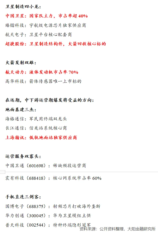 商业航天的投资逻辑遵循 “上游核心部件→中游发射服务→下游应用服务” 的产业链传导规律。短期优先聚焦制造与发射。基建期受益的"卖铲人":卫星制造和火箭发射环节。特别是卫星载荷(通信芯片、组件)和火箭发动机,是技术壁垒和利润率最高的环节。