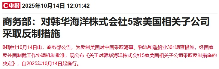 主要原因,还是关税博弈反复:中午12点,商务部发言重申立场,并对韩华海洋株式会社5家美国相关子公司采取反制措施,交通运输部启动航运业、造船业及相关产业链供应链安全和发展利益受影响情况调查。