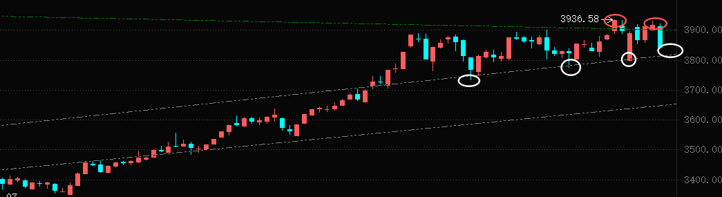 1、本周行情历来罕见,整体波动不大,仍维持在3850一线盘整,但细节却极其蹊跷。周一市场巨幅低开,却全天收复跌幅;周二高开低走,周三前低后高,尾盘大涨,周四稍作稳定后,周五单边大跳水。