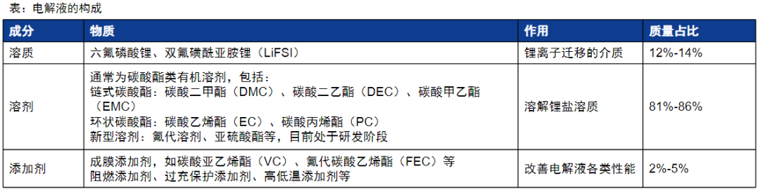 锂电池电解液一般是由高纯度的有机溶剂、电解质锂盐和必要的添加剂等主要材料配置而成,其中溶剂含量最高,质量占比80%以上,添加剂占比最低,约5%。电解液对于锂盐、溶剂、添加剂的纯度、水分和酸含量等要求较高,原料提纯和环境控制成为电解液生产过程的难点之一。