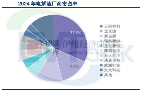 电解液行业呈现“强者恒强”态势,头部企业地位巩固。天赐材料市占率稳居第一,市场竞争优势进一步巩固;比亚迪依托垂直整合战略,电解液自供比例提升,推动产量攀升;新宙邦通过技术迭代与客户绑定,稳居第三位。