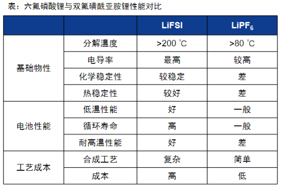 虽然六氟磷酸锂工艺成熟,但其存在化学性质不稳定、低温环境下性能受限等问题。双氟磺酰亚胺锂(LiFSI)作为电解液溶质锂盐具有高导电率、高化学稳定性、高热稳定性的优点,更契合未来高性能、宽温度和高安全的锂电池发展方向,未来有望替代六氟磷酸锂。