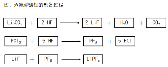 氟化氢溶剂法是目前应用最广泛的六氟磷酸锂制备方法。用PCl5与无水HF反应得到PF5,再制备LiF的无水HF溶液,将其加入混合物液,经反应、结晶、分离、干燥得到高纯LiPF6晶体。