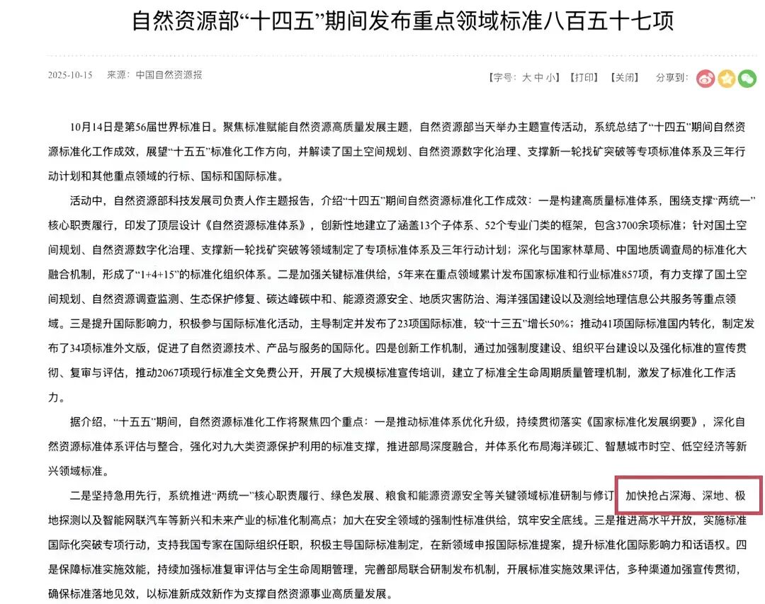 2025年10月14日第56个世界标准日上,自然资源部总结了“十四五”期间的标准化成果,并展望“十五五”新方向。明确将深地探测列为“十五五”战略性新兴产业重点方向,并提出加快抢占深地领域标准化制高点。
