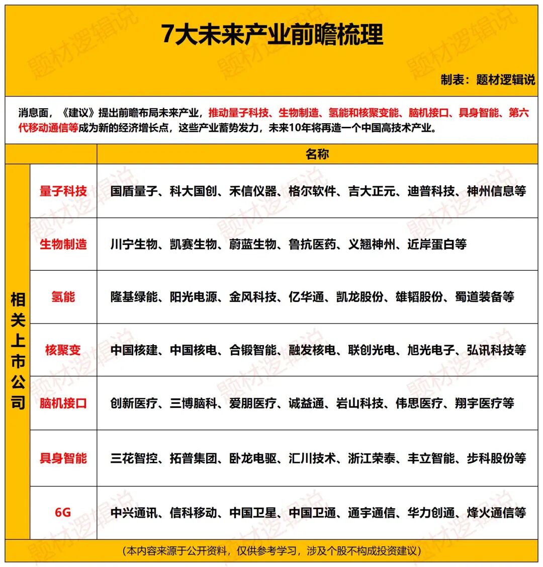《建议》还提出前瞻布局未来产业,推动量子科技、生物制造、氢能和核聚变能、脑机接口、具身智能、第六代移动通信等成为新的经济增长点,这些产业蓄势发力,未来10年将再造一个中国高技术产业。