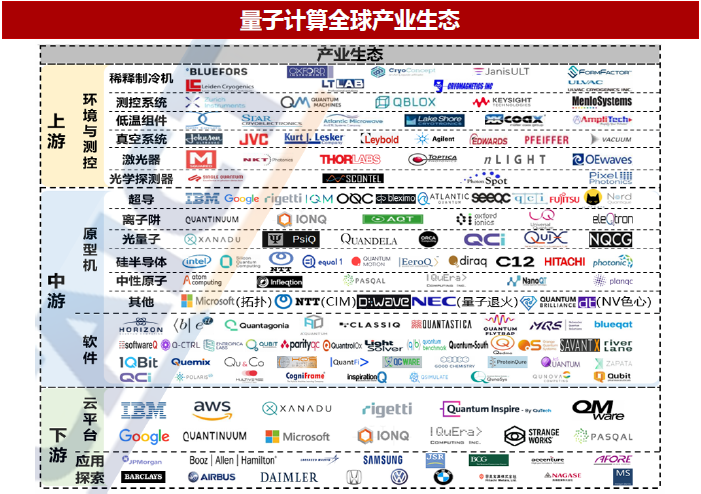 在量子计算领域,美国领先,中国位列第一梯队。美国在量子计算产业链上游稍有短板,中游与下游领先。中国在中游取得各项技术突破,但在下游应用生态方面略有逊色。