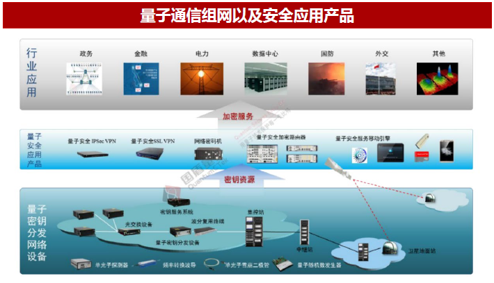 量子密钥分发本质是利用量子的不可复制性以及测量的随机性来生成量子密钥,当双方确认密钥安全性后,可基于经过密钥加密后的数据在网络上进行常规传输。随着量子计算技术的快速发展,RSA等传统加密方法面临被强算力破解的风险,量子密钥分发技术有望先于量子计算率先布局。目前,量子密钥分发(QKD)技术已经实现初步商用。