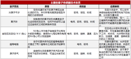 量子精密测量的实用化产品是量子传感器。目前主要的量子传感器技术体系包括冷原子干涉、离子井、金刚石氮空位(NV)色心、超导电路、原子蒸汽。