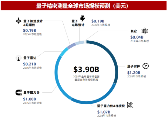 量子时钟、量子重力仪&梯度计、量子磁力计有望成为2035年市场规模最大的3个应用,预计市场规模可达到12.0、10.7、10.0亿美元。