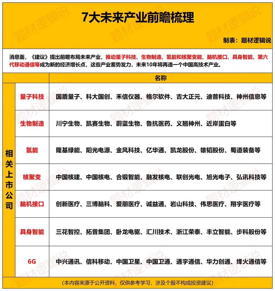 未来产业:量子科技、生物制造、氢能和核聚变能、脑机接口、具身智能、第六代移动通信(定位:成为新的经济增长点。这些产业蓄势发力,未来10年新增规模相当于再造一个中国高技术产业)