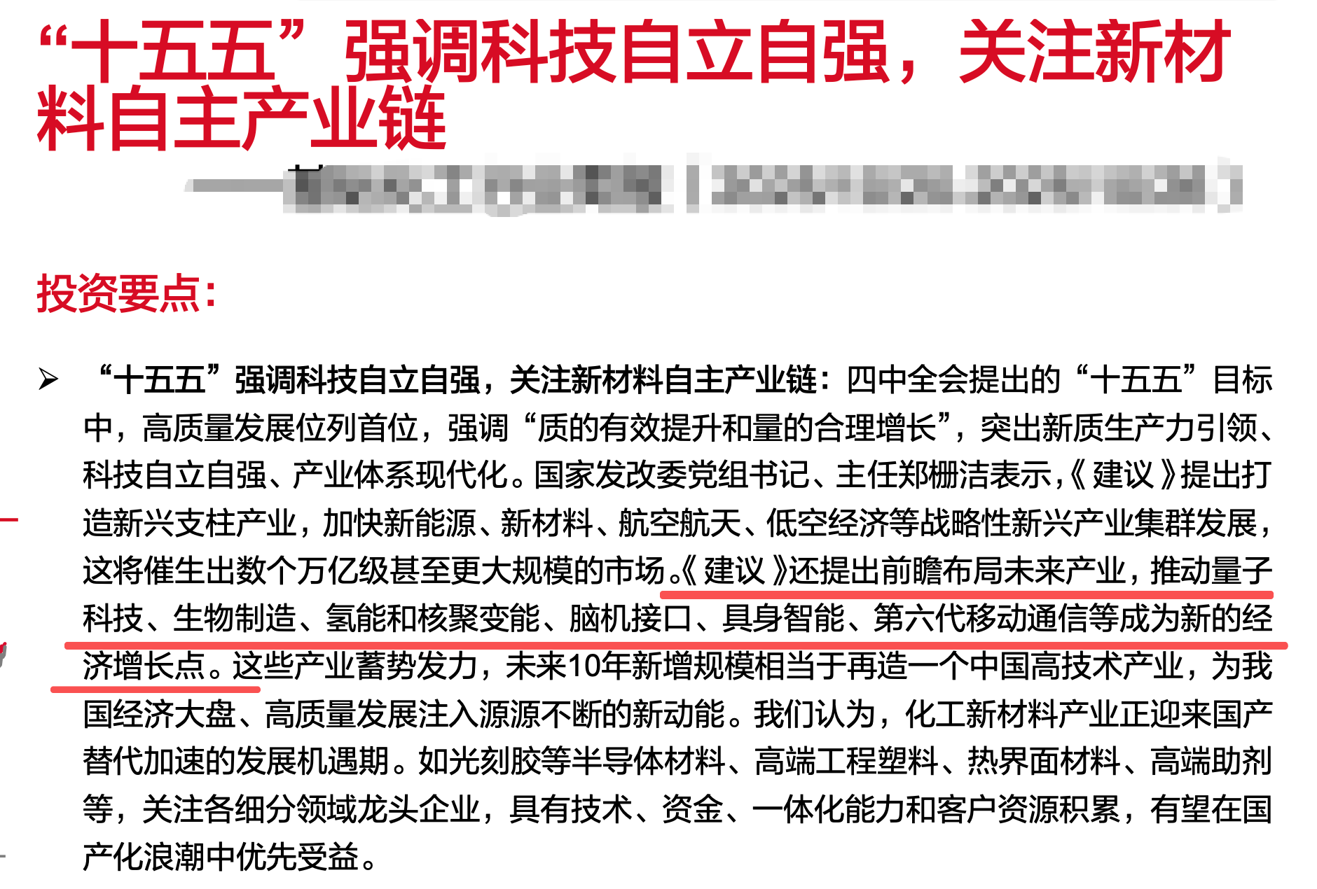 最近顶层在制定国民经济和社会发展的地十五个5年规划的建议中提出要前瞻布局未来产业,推动:量子科技、生物制造、氢能和核聚变能、脑机接口、具身智能、第六代移动通信等成为新的经济增长点,这些是结构转型,高质量发展的重点发力方向。所以以上相关的核心龙头公司,都会不断有催化剂!