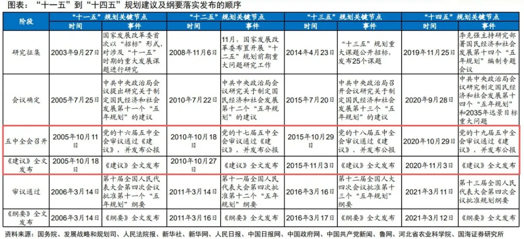 复盘过去4次“五年规划”,《建议》全文发布及《纲要》发布后的一个月左右时间,这一时段往往成为市场交易“五年规划”主题的关键窗口期。如2020年“十四五”规划发布后,新能源板块曾开启长达两年的主升浪行情。